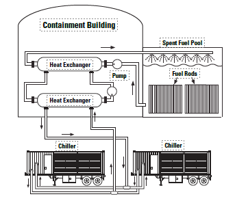 Nuclear reactors use highly radioactive materials to produce great amounts of heat. These processes are housed in containment buildings that must have a constant supply of chilled water and air. The byproduct of the reactor is spent fuel that remains radioactive and must be constantly cooled in a pond or tank.